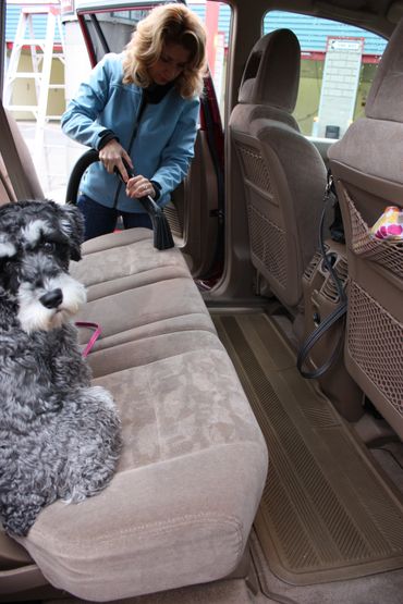 A bag with Tire Dressing, Glass Cleaner, Multi-Purpose Cleaner, Wax/Polish Spray, Blue/Green & Orange Microfiber Cloth and an Air Freshener.
